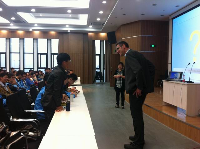在座谈会的最后, Hussmann教授特意为同学们留出了问答环节。同学们的热烈参与将会谈的气氛推向了高潮。有通过现场翻译,也有同学直接用英文和Hussmann教授进行了交流,而他也很耐心地向大家做了解答,甚至举了很多小例子使解释更加丰富形象。终于,在浓厚而温馨的学术氛围中,同学们依依不舍地结束了这场座谈会。