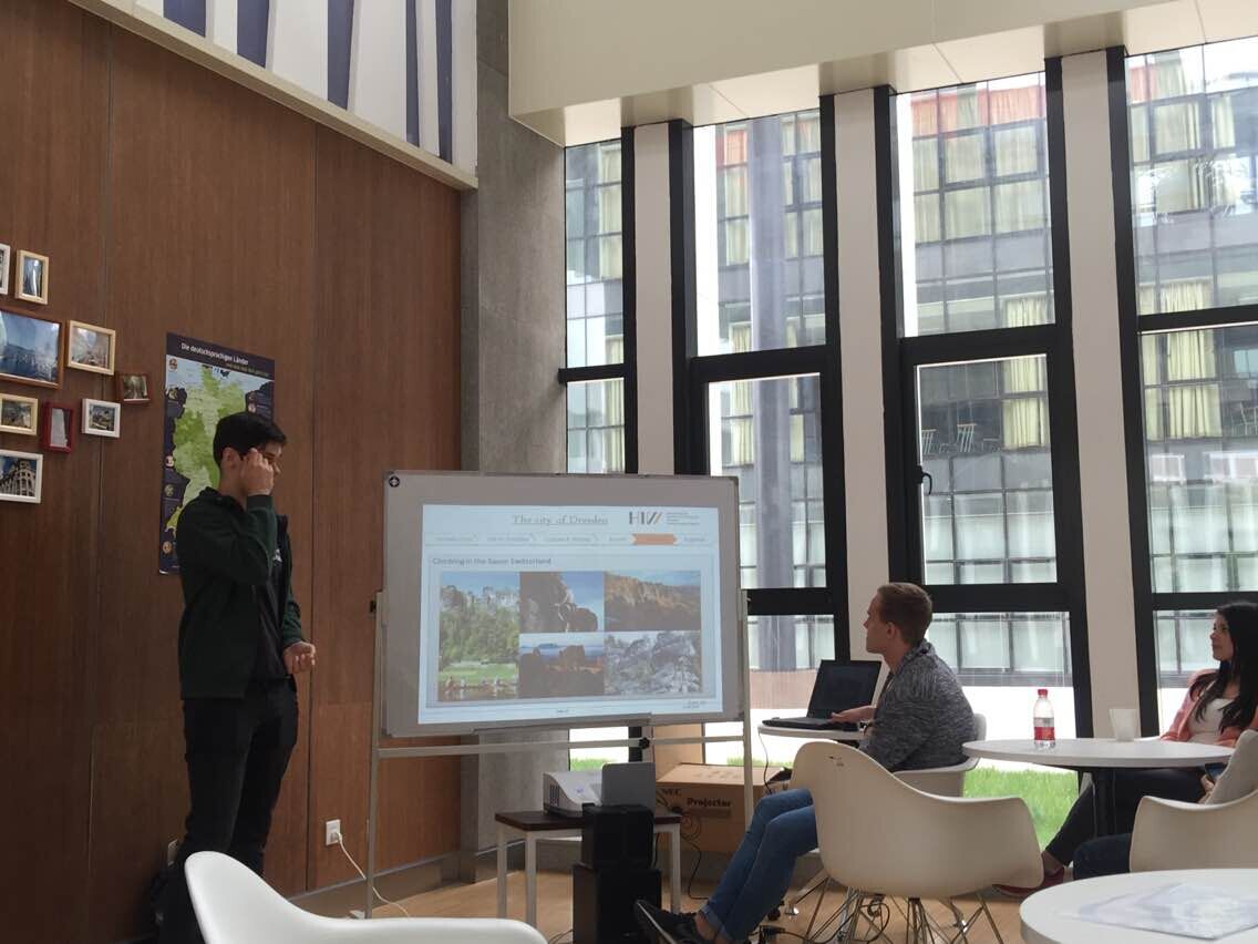 首先,来自德国的朋友向同学们介绍了他们所生活的城市和学校的特点。咖啡吧的同学们则借助一张张图片,将德国美食与中国美食对比着讲述。整个过程充满了互动和小笑话,咖啡吧里欢声笑语。
