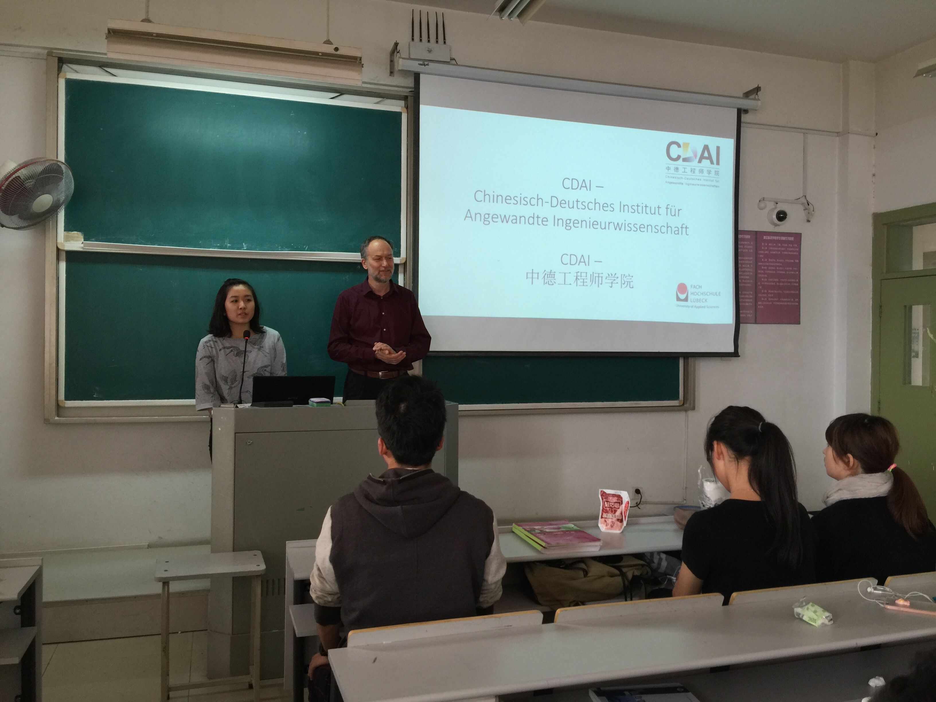 10月22日下午1时30分,土木专业14级学生与德方教授的见面会在A教学楼409教室中举行。参与活动的有来自吕贝克应用科技大学的3位德国教授Prof. Grottker,Prof. Lonrenzl,Prof. König,邓鸿羽女士,Grässner女士,CDAI的文献民教授和王俐老师及ACG盒子 土木工程专业的全体学生。