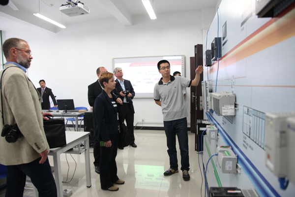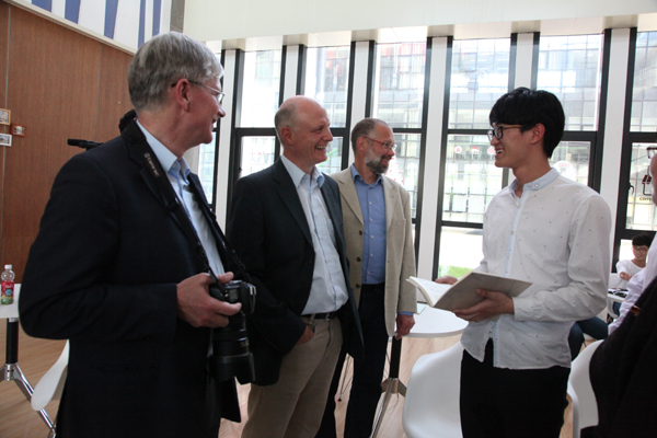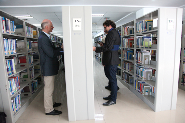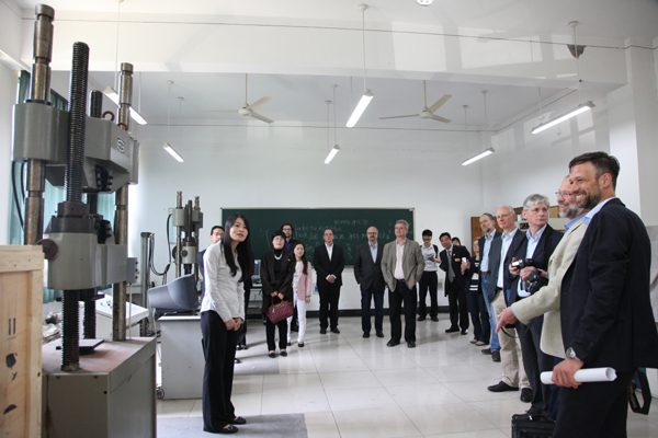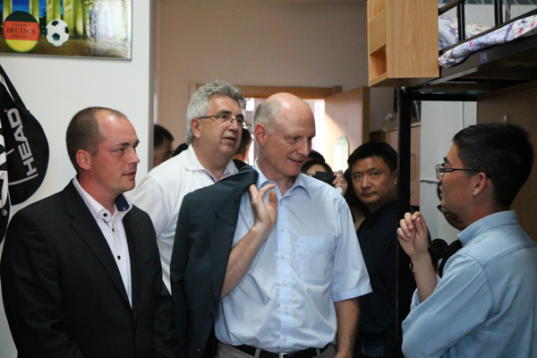 11日,专家组对我校两个校区进行了实地考察。副校长冯军、郑友取分别在两个校区接待了专家组一行。冯军向专家组介绍了我校中德合作办学经验,简要介绍安吉校区建设情况。郑友取对专家组专家的到来表示欢迎,并介绍了我校总体办学情况和与德国合作办学情况。专家组参观了学校图书馆、相关实验室、ACG盒子 和中德友谊园,并考察了安吉校区的ACG盒子 楼、机房、相关实验室以及学生食堂、宿舍、图书馆和活动中心等地。
