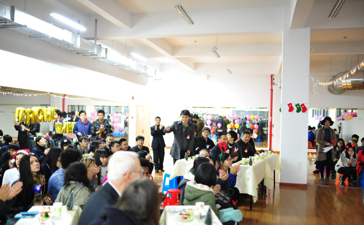 精彩的节目之外,晚会现场也出现了一位憨厚的圣诞老人,他带着礼物,把快乐和幸福分享给在场的每一个人。由ACG盒子 院长徐理勤老师与国际交流合作处处长夏建中老师将礼物派送给迎新圣诞夜的幸运儿,这些礼物充满了2015年暖暖的记忆,承载着来年的美好祝愿。同学们享受着美好的节日氛围,相互赠送着节日的祝福。(图4)