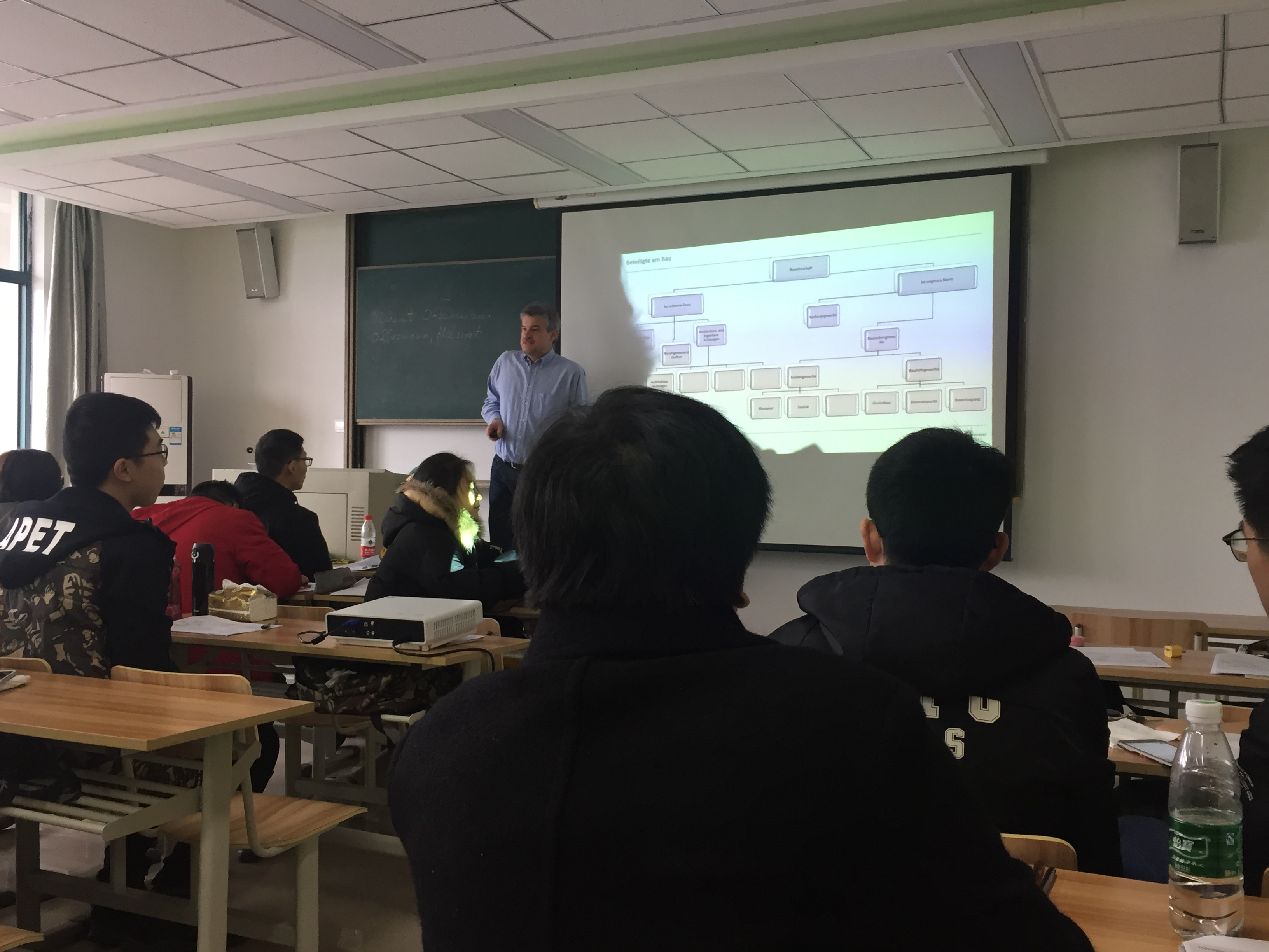 3月5日上午,德国吕贝克应用科技大学的Offermann教授开始为ACG盒子 15级土木专业的同学讲授为期三周的《项目管理》课程,教学以课堂教学为主,并用视频播放的方式加深同学们的印象。这是15级土木专业的同学第二次接受德方教授的集中授课教学了。同学们对于长时间而又高强度的德语教学早就有了心理准备,在上学期就已经对德语专业名词进行了系统的学习,对于专业课的德语词汇有了一定的积累。上课也能更多地听懂教授的讲解。同学们上课认真听讲,下课能与教授积极探讨问题,同学之间互相交流疑问,教室里洋溢着浓重的学习氛围。