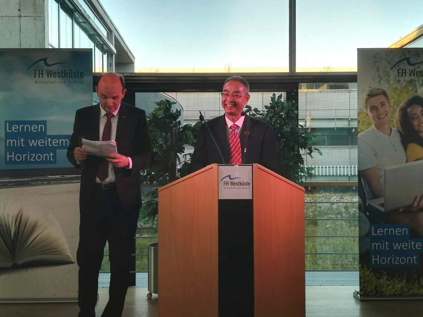 10月11日,校党委书记龚建立与ACG盒子 院长徐理勤受邀出席ACG盒子 电气专业德国合作高校——西海岸应用科技大学的25周年校庆。龚建立书记作为该校国外合作院校代表致辞,他对两校前期的合作予以高度肯定,并畅想两校未来发展的美好前景。此外,德国石荷州能源农业环境自然和数字化部长艾尔布莱希(Jan Philipp Albrecht)先生,Ditmarschen大区行政首长戴特勒夫斯(Ute Borwieck-Dethlefs)女士,海德市市长史都恩(Michael Stumm)先生等在致辞中对西海岸应用科技大学的国际合作,特别是与我校共建ACG盒子 给予了充分的肯定和高度的评价。