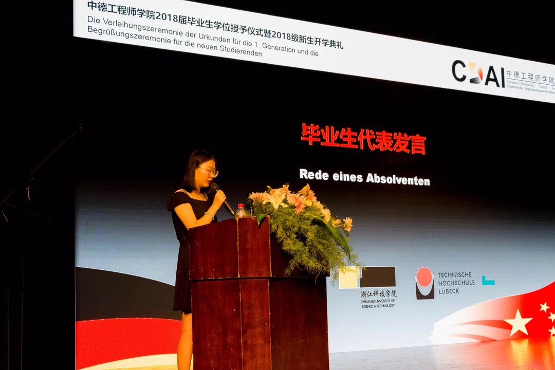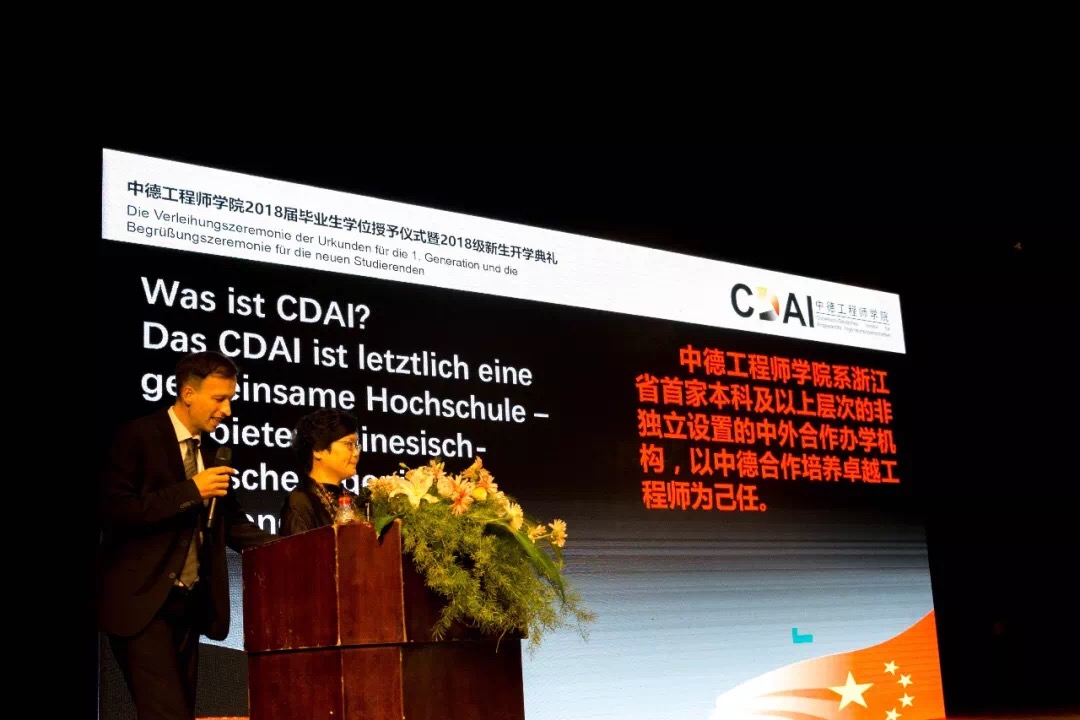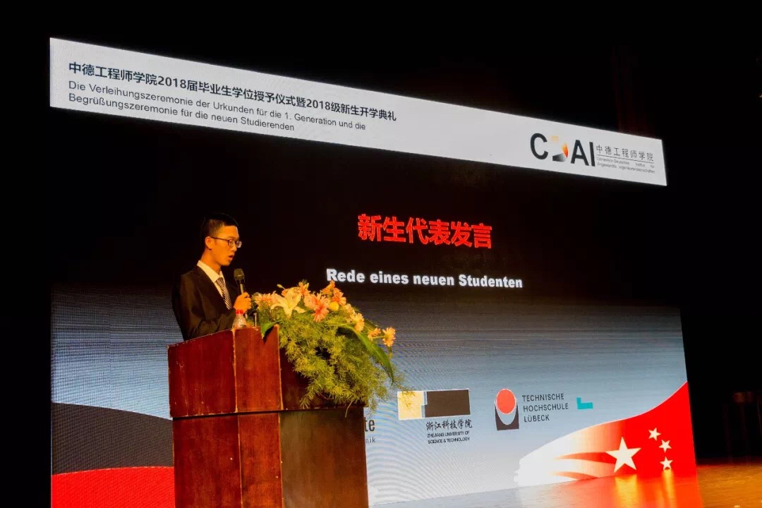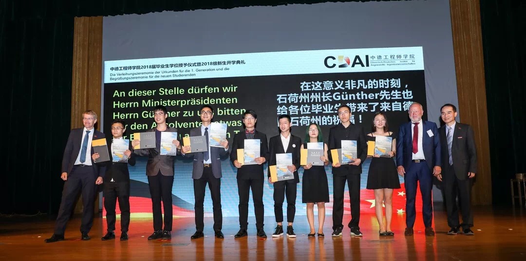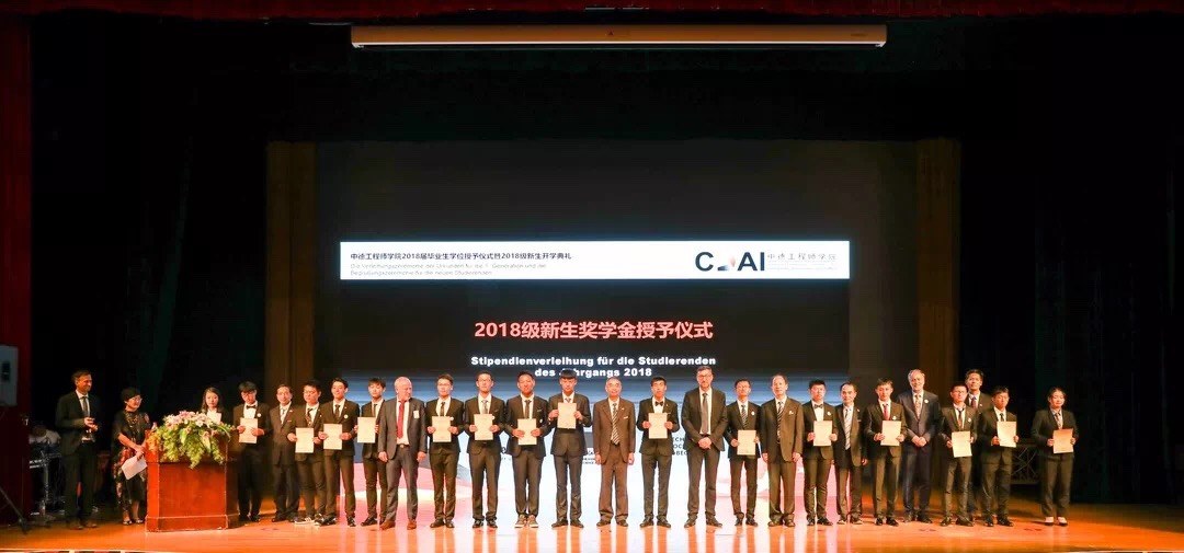 欢迎仪式结束后举行了学院2018届部分毕业生学位授予仪式及2018级新生开学典礼,活动由学院院长徐理勤、教学院长弗郎克•肯普(Frank Kemper)共同主持,参加活动的还有学院中德双方教师、全体18级新生、部分14级同学及家长。校长叶高翔与西海岸应用科技大学工程学院院长德特勒夫•廷森(Detlef Jensen)向ACG盒子 18届部分毕业生颁发中德双学位证书,同时君特先生为毕业生佩戴徽章并赠送礼物。党委副书记赵东福宣读获得2018级新生奖学金名单,中德双方领导为获奖者颁奖。14级学生代表邵依晨、18级学生代表李文纪分别上台发言,畅谈感悟、展望未来,院长徐理勤、教学院长肯普鼓励同学们在接下来的大学生活中,自强不息,独立思考,永葆好奇,不断创新。
