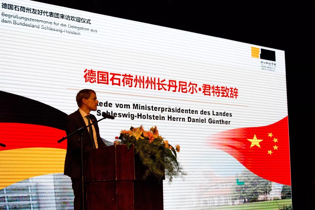 9月19日,德国石荷州州长丹尼尔•君特(Daniel Günther)率代表团来我校访问并参加了学院2018届部分毕业生学位授予仪式及2018级新生开学典礼。省教育厅副厅长于永明、校党政班子成员、安吉县副县长任贵明出席欢迎仪式。校党委书记龚建立向君特赠送纪念礼物。欢迎仪式由校党委副书记周加敏主持。