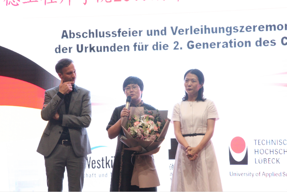 典礼第三章为“征程”,龚建立书记、西海岸应用科技大学校长Hanno Kirsch教授以及吕贝克应用科技大学的Frank Kemper教授分别致辞。其中Kemper教授还精心制作了视频,他的别出心裁、激情四射的演讲,给了同学们一份惊喜。冯军副校长随后为学院校友联络员颁发了证聘书,希望将中德精神薪火相传。而毕业生与老师们的朗诵与合唱更是将这份浓浓师生情传递给了在场的每一个人。