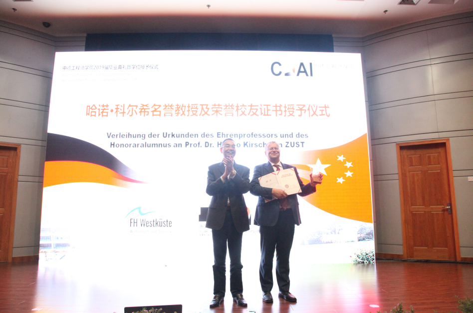 典礼第二章为“荣耀”,冯军副校长为优秀毕业生代表颁发了荣誉证书,毕业生代表方秋英与家长代表包恺的父亲也分别发表了讲话,讲述了自己的感受与感恩。典礼最隆重的一项即学位授予仪式,由龚建立书记、Hanno Kirsch校长、Frank Kemper教授分别为两个专业的毕业生颁发毕业证书和学位证书、校训纪念章和学院纪念品。
