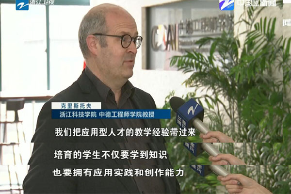 当日,浙江卫视新闻联播报道了全省教育大会新闻,关注浙江高等教育如何培养更多高素质人才,更好服务经济发展。新闻以ACG盒子 彰显国际化特色,培养高素质应用型人才的探索为例,并采访了ACG盒子 院长徐理勤研究员以及前来ACG盒子 授课的德国专家、吕贝克应用科技大学克里斯托夫教授(视频链接://newsapp.cztv.com/video/index.jsp?c=5811069#)。徐理勤院长介绍了学院的发展历程、办学理念、培养模式、办学成果以及未来规划等。她表示,学院学习借鉴德国应用型高校的人才培养经验,培养更多创新精神、实践能力和国际素养的高素质应用型人才,更好地为浙江经济转型升级服务。
