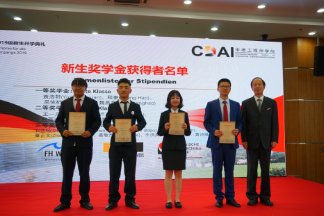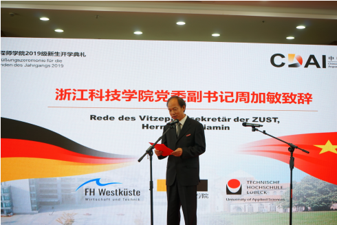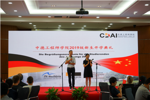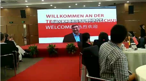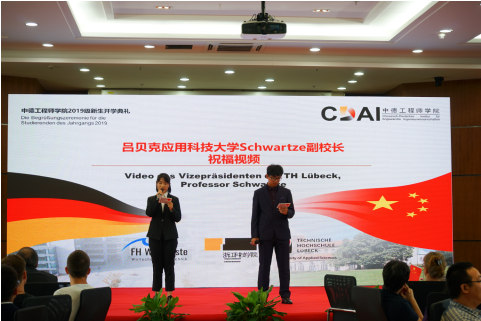 典礼在学院薛文副院长与教学院长坎普教授的共同致辞中拉开了帷幕。典礼由“喜迎新生”与“承上启下”两幕组成。首先,周加敏副书记向新生们介绍了学院优势与前景,对大家的到来表示欢迎。吕贝克应用科技大学副校长Schwartze教授虽遗憾没有到现场,但也以视频的方式为新生们带来最真挚的问候。