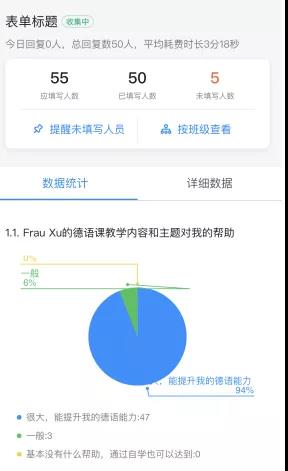 在线发放55份关于在线教学质量的调查问卷,收到50名同学的反馈,总体满意度颇高且对教学方式和教学内容提出了建议。其结果如下: