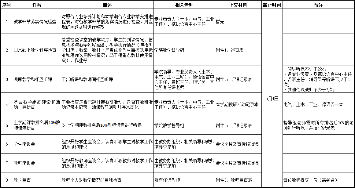 学校定于第9周、第10周(4月17日~4月30日)进行期中教学检查。现将ACG盒子 期中教学检查任务分配如下表,请老师们按要求及时完成任务并将相关材料电子版发送至邮箱[email protected]