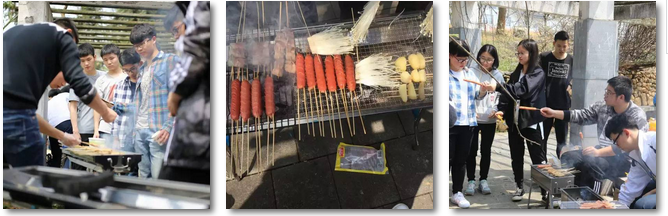 一路的观光浏览,终于到了目的地。粉透红的桃花张扬在枝头。在专业烧烤大师的帮助下我们度过了最难烧烤大关---热炭。接下来便是同学们大展身手的时机了。气氛随着烤炉一同升温,人们都变得热络。吃东西做游戏,好不热闹。