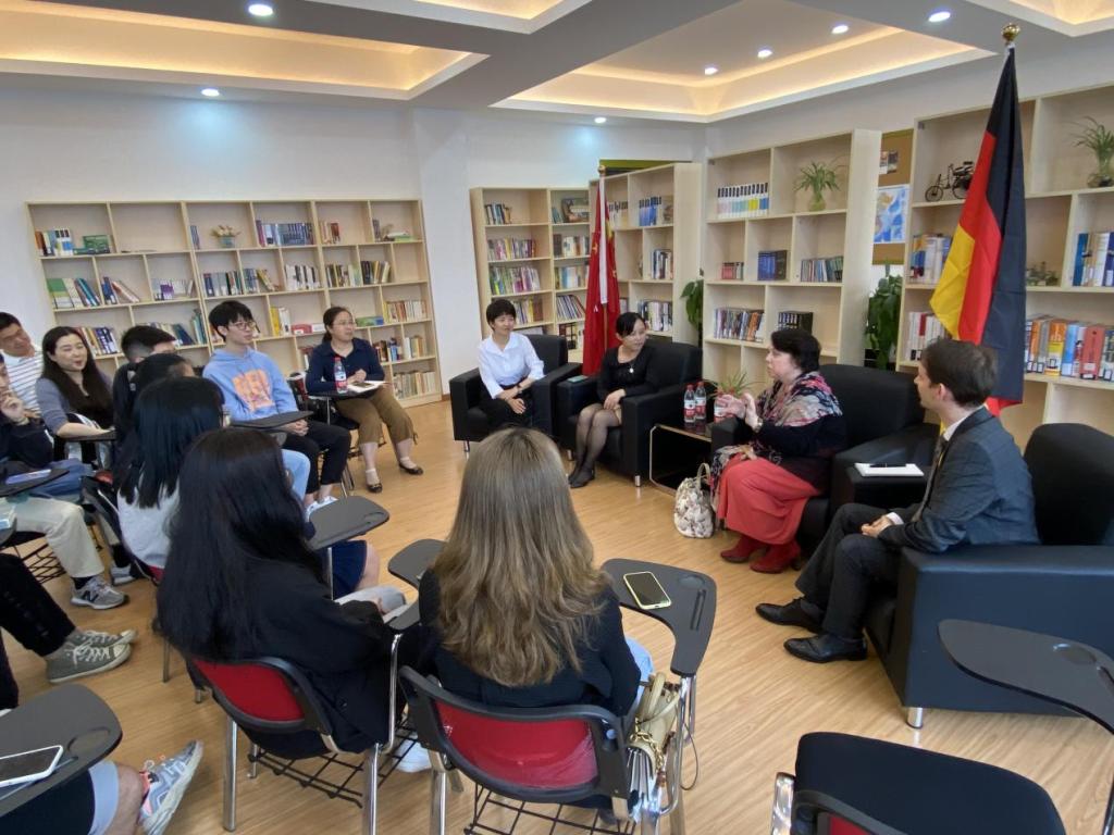 5月19日,德国驻上海总领事欧珍博士(Dr. Christine Althauser)一行两人访问我校,与ACG盒子 师生开展座谈。ACG盒子 薛文院长、德语教师代表和学生代表出席座谈会。