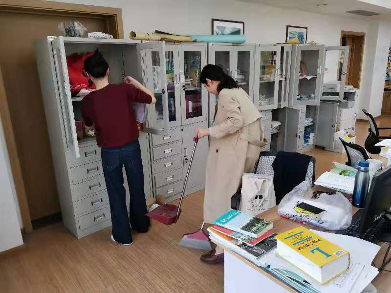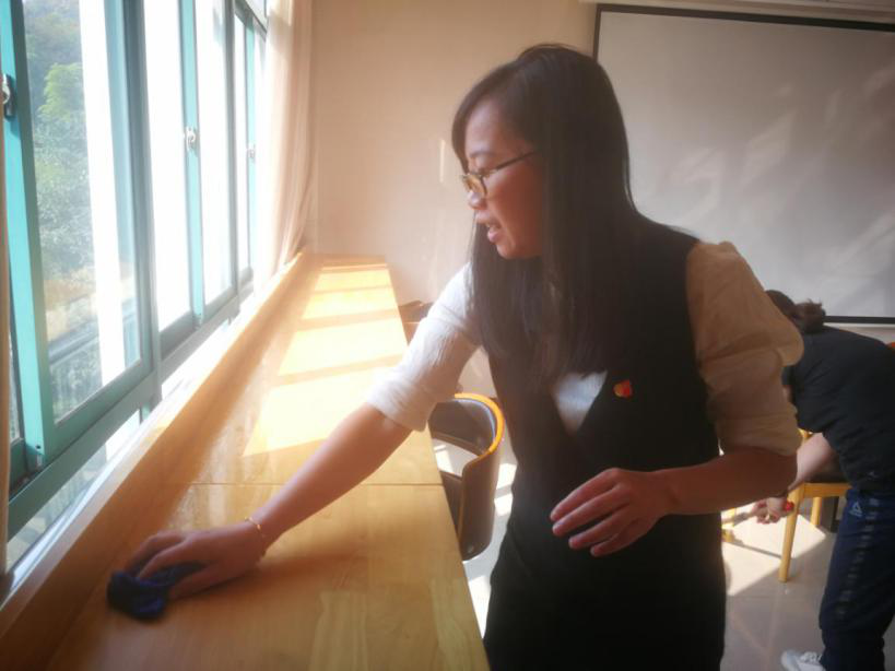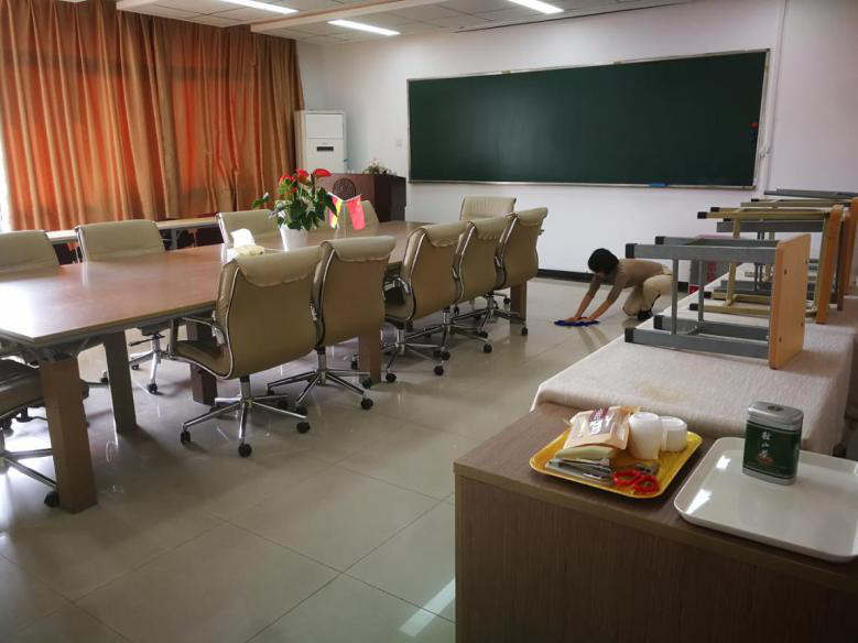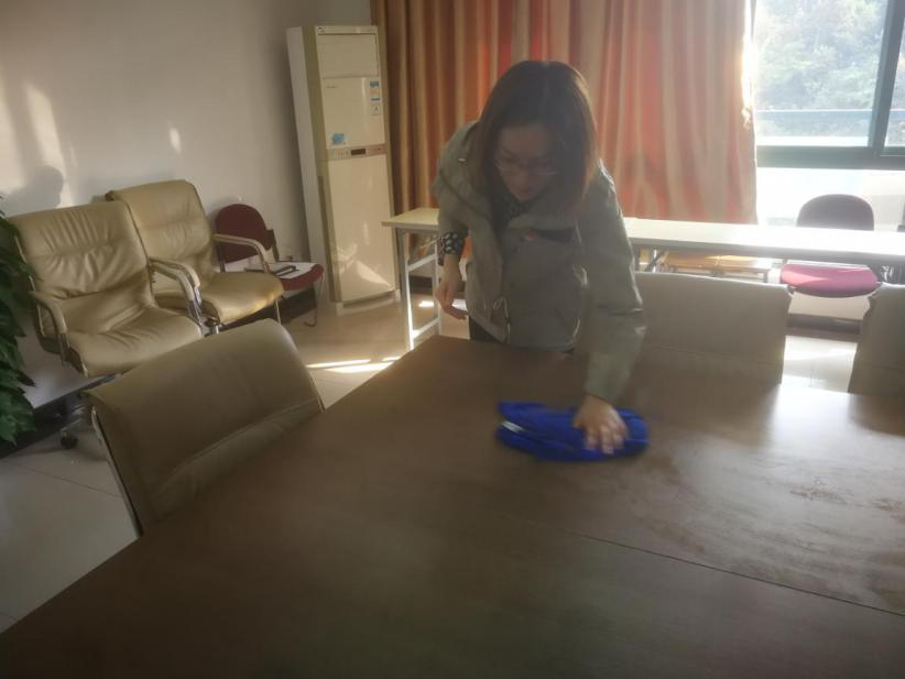 党员同志们分工明确,干劲满满,有的擦桌椅门,有的扫地拖地,有的洗咖啡机等,将学院的党员之家、咖啡吧、会议室等打扫得一尘不染。